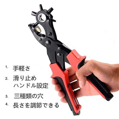 - 穴タイプ:丸x3・楕円x1・細長x2、計6個穴、違う形状の穴が加工できますので、実用性満満です。手で回転させて簡単にサイズ変更して、回転式で穴をキレイにあけることができます。
