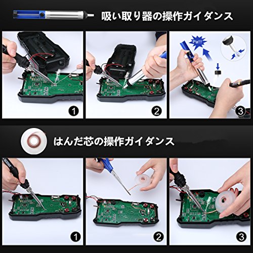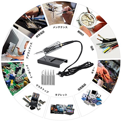 - 【充実なセット】はんだごて、5xごて先、はんだごて台(スポンジ付き)、はんだごてチューブ、吸い取り器、ワイヤストリッパーカッター、ドライバー、絶縁テープ、はんだ芯、2xピンセット、2x電子ワイヤー、8x携帯修理ツールと収納ケース。