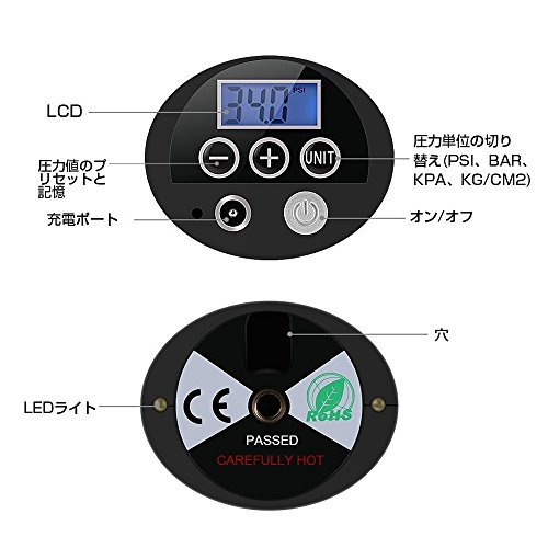 - 空気圧測定と独特な設計:精度:±1.5psi。デジタル表示なので簡単に読み取れる便利な空気入れ スマートエアーポンプ。バックライト液晶付き、ガレージや暗闇でも作業がしやすいです。LEDライト2個あり、夜の使用も安心。そして、失わないために、エアチューブをインフレータの底部の穴に挿すことができます。