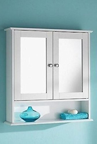 A Stylish wall mounted bathroom cabinet with double mirrored doors & a shelf finished in white with a chrome handle.This cabinet has an elegant design, which is functional and a durable piece of furniture for the bathroom.