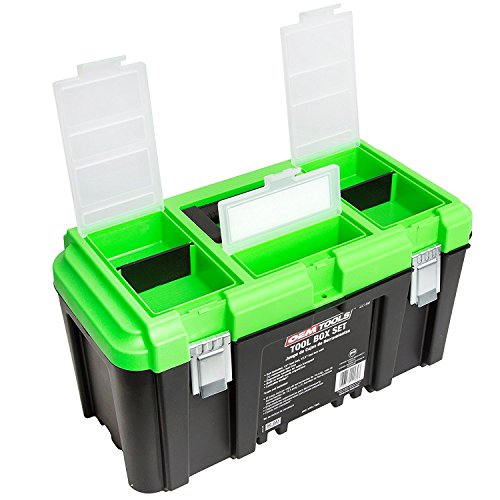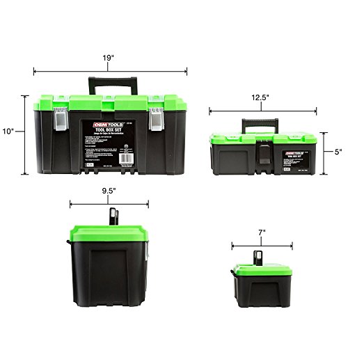 - Set includes: 19" tool box, 12.5" tool box and removable tool tray Metal latches for secure storage