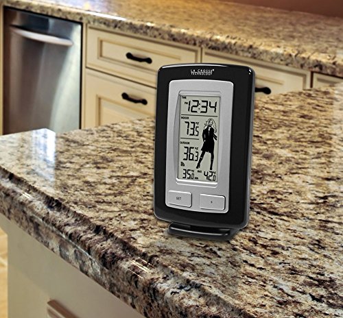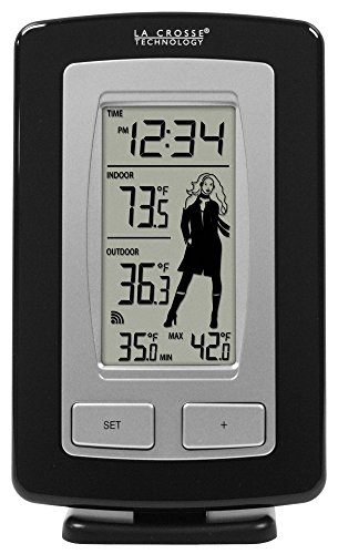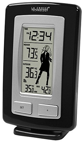 La Crosse Technology WS-9760U-IT-CBP wireless weather station with weather-girl icon. 5 icons to show you what to wear based on the outside temperature. Features indoor & outdoor temperature with min/max temp values shown for the outdoor temp with 12/24 hour manual time display.