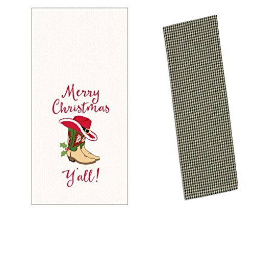Great country western Christmas kitchen towels set.One waffle towel with boot and western hat and one dark green cheque tea towel.Great for gift giving or to brighten up your country loving home this holiday.
