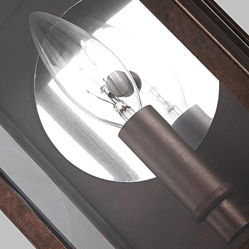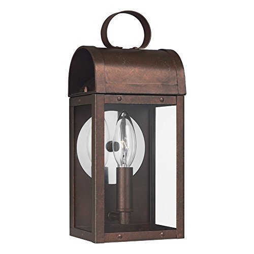 The Sea Gull Lighting Conroe one light outdoor wall fixture in weathered copper enhances the beauty of your property, makes your home safer and more secure, and increases the number of pleasurable hours you spend outdoors. Inspired by traditional Colonial lanterns, the design of the Conroe outdoor lighting collection by Sea Gull Lighting is created using bent aluminum at the roof and a reflective mirror detail to enhance the incandescent light gleaming through Clear glass, while the integrated LED version is finished with Clear Seeded glass. The overall construction is hand-riveted for an authentic touch. Offered are small one-light, medium two-light and large three-light outdoor wall lanterns in either Black or Weathered Copper finishes. Incandescent candelabra base or integrated LED lamping are available. The advanced, integrated LED option has warm-on-dim technology that warms in color when dimmed, going from 2700K to 2200K and is California Title 24 compliant.