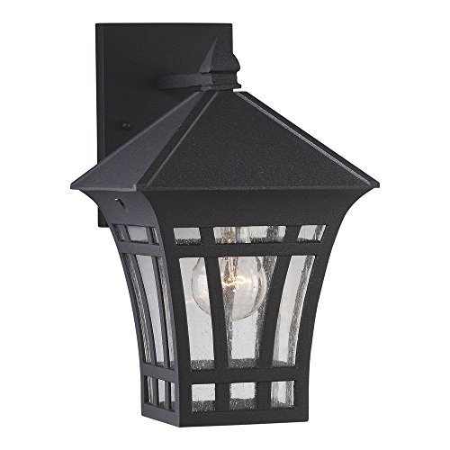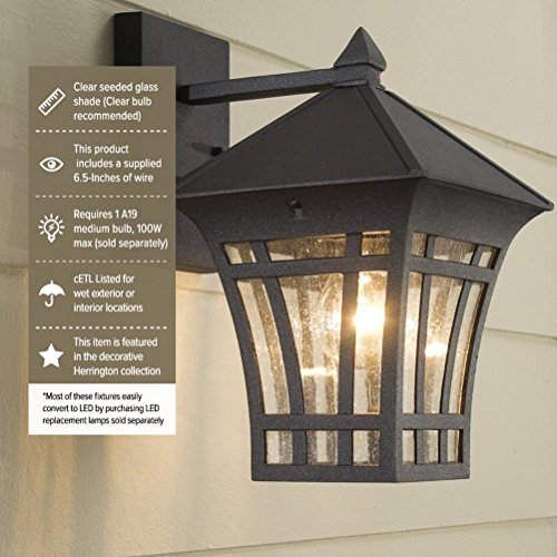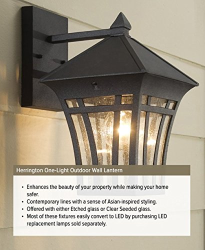 The Sea Gull Lighting Herrington one light outdoor wall fixture in black enhances the beauty of your property, makes your home safer and more secure, and increases the number of pleasurable hours you spend outdoors. There is real curb appeal in the design details of the Herrington outdoor lighting collection by Sea Gull Lighting. Traditional elements are updated with contemporary lines with a sense of Asian-inspired styling. In a classic Black finish, the assortment is offered with either Etched glass or Clear Seeded glass and includes a small and large one-light outdoor wall lanterns, a one-light outdoor pendant, a one-light outdoor post lantern and a one-light outdoor ceiling flush mount. Herrington is available in incandescent and ENERGY STAR-qualified fluorescent models, and those with Clear Seeded glass can easily convert to LED by purchasing LED replacement lamps sold separately.