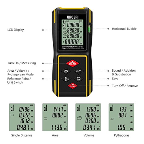 URCERI Laser Measure (100.5m), Digital Laser Distance Meter with Mute Function,LCD Backlit Display and Bubble Levels, Measure Distance,Area and Volume,Pythagorean ,Battery IncludedURCERIレーザー測定(100.5m)、ミュート機能付きデジタルレーザー距離計、LCDバックライトディスプレイと気泡レベル、測定距離、面積と容積、ピタゴラス、バッテリー付属 [並行輸入品]