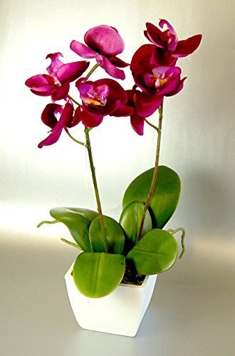 This very realistic looking potted orchid is made of artificial silk and is a good substitute for the real one.;The height of the arrangement including the pot is approx.34cm.;The white pot is 8cm high 8.5cm wide at the top and 6cm at the bottom.;The surface of the pot can vary from smooth to slight crackle effect.;The two stems of orchids have four flowerheads each. The flowers are fuchsia pink with speckled middle.