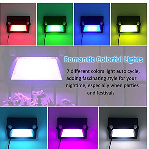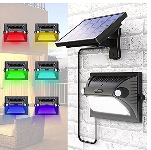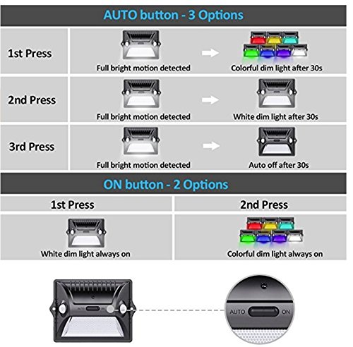 Sensor Light with Dual Motion Sensor-Built-in motion detector, dual sensor balls head of Solar Light gets a longer sensor length of 3.5m-5.5m and a wider 180° sensing angle. Suggested install height is 1.7m-2m.5 Intelligent Working ModesThe Solar light will auto lights up in darkness, easy to set the mode.1. Motion sensing + colorful mode: White Light on full brightness when motion detected, auto turn to colorful dim light after 30 seconds. (7 colors dim light auto cycle) 2. Motion sensing + white mode: White Light on full brightness when motion detected, auto turn to white dim light after 30 seconds.3. Motion sensing + Off mode: White Light on full brightness when motion detected, auto turn off in 30 seconds. 4. Long white light mode: always on with white dim light in darkness. 5. Long colorful light mode: always on with colorful dim light in darkness. (7 colors dim light auto cycle)