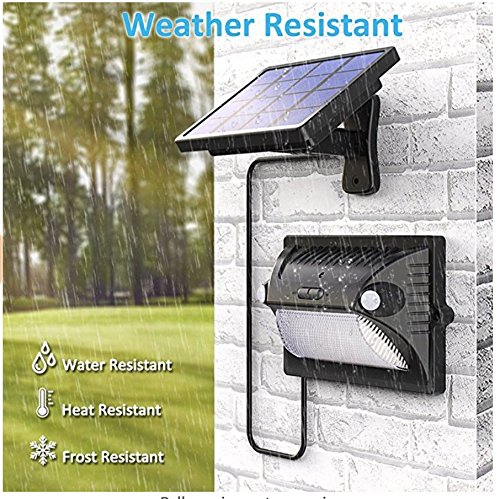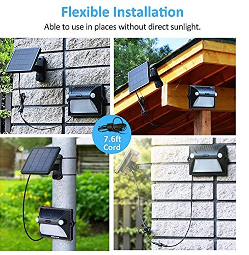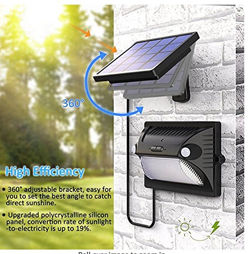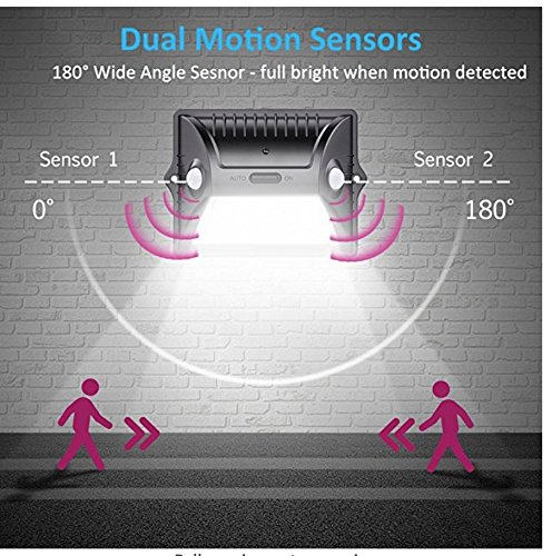 - Two Pieces Design- Solar panel and light body are designed separately, you can install them severally within 2m, put the solar panel in well-lighted location for catching more sunshine, and locate the light body at any place you desired.180° Dual Motion Sensing-Compared with single motion sensor light, dual motion sensor heads enhance with 18 feet larger sensing scale and 180°wider sensing angle, which ensure high performance with no blind area.