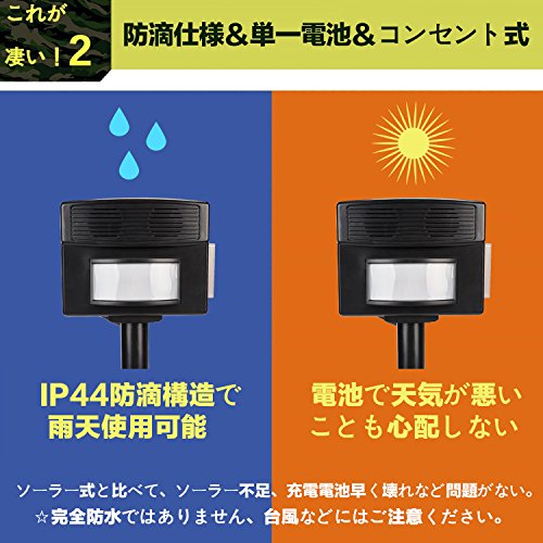 - 【省エネ】:四つの単一電池だけで、PIR運動検出器や超音波同時に開くなら、6ヶ月連続で使える。超音波だけ開くなら、一年連続で使える。電池式ので、ソーラーが不良、天気が悪いなどの心配が必要ない。