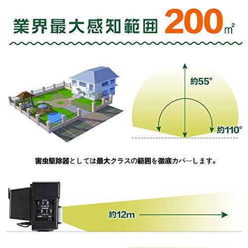 - ♥ 一年安心保証♥【最大感知範囲は200㎡】:被害区に向けて設置、赤外線センサー(PIR)平角度約.110°上下角度55°最大12mに迷惑動物の動きを感知し、変動超音波を放射することにより、感知エリア内から害獣、害鳥遠ざけるので、動物被害を減らすことが可能。害獣対策装置、鳥よけグッズ、ネコ被害 野良猫猫対策、動物撃退器 超音波 電池式/コンセント式。