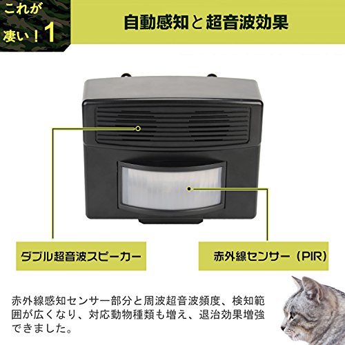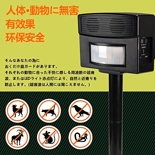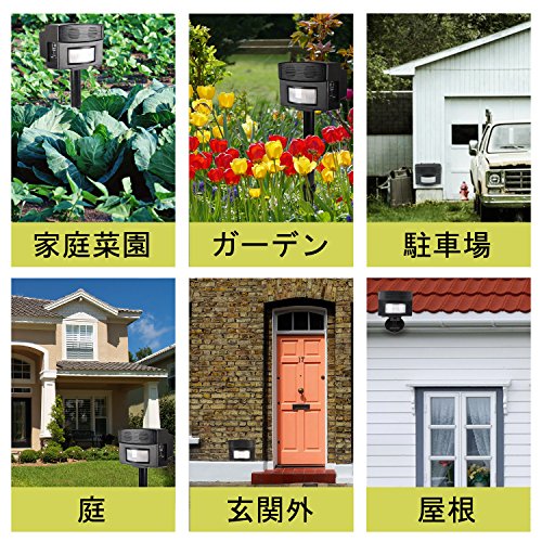 - 【高い安全性の動物撃退器】超音波が大音量に聞こえてしまうけど、人体・環境には無害だから安心。猫がにわにはいってきて糞をする、小型動物が庭に入ってきて荒らしていく、鳥に畑が荒らしされる、せっかくの花壇、家庭菜園をきれいに保ちたい、ベランダに鳥がフンをする。こんな方にオススメです。