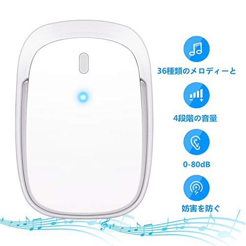 - 【36種類のメロディーと4段階の音量】 プッシュボタン送信機のペアリングを行う前に、Unihohボタンを押し、36種類のメロディーの中からお好みのものをお選びください。4段階の音量に設置できます。メロディーをお選びになり、ご自分のニーズに合わせた音量に調節するだけです