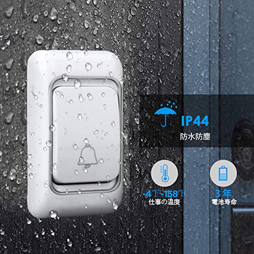 - 【丈夫かつ省エネ仕様】:弊社のワイヤレスドアベルは、無毒性で無害かつ再利用可能でホコリ、雨や高温にも強いABS素材製です。リモート送信機ボタンの耐候性はIP44等級 屋内ならびに屋外でのご使用に最適です。内部の電池は1年間以上にわたってお使いいただけます