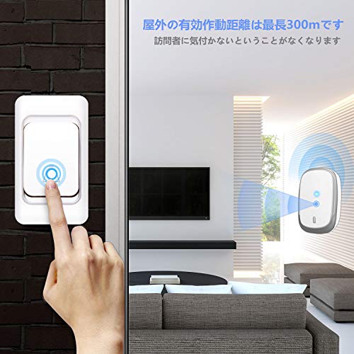 - 【300mの強力な貫通力】 屋外の有効作動距離は最長300mです。スチール製、木製のドアや外壁、内壁などを貫通します。誰かがドアベルを押すと、LEDインジケーターが点滅し、メロディーが流れるため、訪問者に気付かないということがなくなります