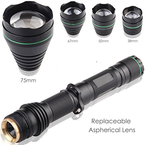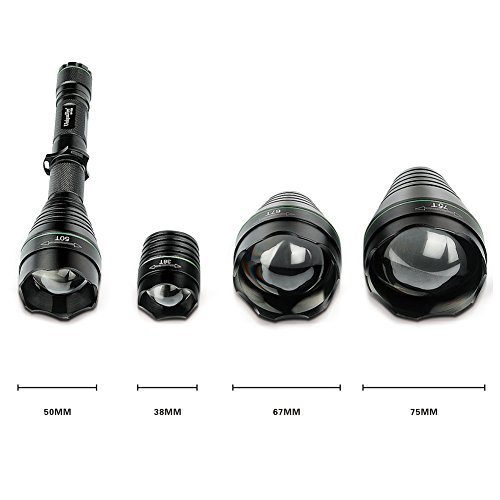 - ASPERICAL LENS: 38MM /50MM/67MM/75MM Lens. It gives you the flexibility to screw in different caps for different hunts and distances. Illuminate much farther with smaller light spot.