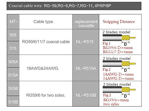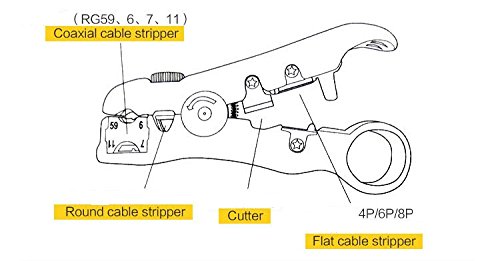 Instructions: 1.Push the cassette out of the housing, push from the front of the cassette. 2.Cassette is reversible, one side is available for RG59/RG6 and another side is for RG7/RG11 3.FOR stripping coaxial cable. a.Insert the cable until it aligns with the cable guide. b.Insert your index finger into the stripper's finger ring, rotate the stripper by counter clockwise 3-5 times. The cable insulation is cut while you are turning the stripper. c.Open the jaws and remove the cable. Pull away the outer jacket and dielectric to expose the inner conductor. d.Stripping distance is designed for 6mm, for each dielectric and inner conduct. 4.for stripping round networking cable: a.insert the cable into the second stripping hole, rotate 1-3 times at counter clockwise, and then open the jaw and remove the outer jacket. b.he black color adjusting knob is for adjusting the blade's depth. Turn clockwise for increasing the blade's depth and counter clockwise for reducing the depth. c.For cutting coaxial cable, round networking cable or flat telephone cable, place the cable in position and then squeeze the handles. 5.For cutting coaxial cable, round networking cable or flat telephone cable. Place the cable in position and the squeeze the handles. 6.For stripping flat cable, insert the cable between the stripper blades, squeeze handles, cable must be kept perpendicular and then pull from the tool. a.Insert 4P/6P cable into the two-bladed side of the tool's stripper until it touches the stop guide. b.Insert 8P cable into the two blades side of the tool's stripper and let it extend a little past the lower cut blade.