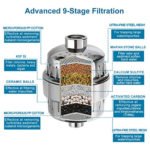 - ご使用のシャワー水:ピュリファイupsimples 9-stage設計されたシャワーフィルタは、耐錆性、耐腐食性、などの水パイプ構造の重金属を除去する塩素、堆積物をクレンジングして、シャワー水と浴室の拡張性を使用することで、藻、カビの成長を防ぎ、あなたと家族を保護し、有害な化学物質からシャワー時にひどい臭を除去。