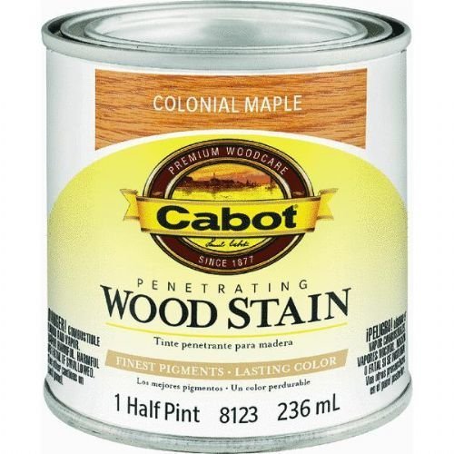 Finish : Colonial Maple. An oil-base, semi-transparent wood stain which penetrates into wood to highlight wood grain. May be used on all types of wood in brush or wipe-on method with minimum grain raising. Deep uniform color penetration. Covers up to 600 sq. ft. per gallon. Dries tack-free in 1 hour. Product uses: For all bare or new wood, doors, trim, cabinets, furniture, floors, beams, hobby, or crafts. Do not use over previously sealed or varnished surfaces which will not permit the stain to penetrate properly. This stain may be used in exterior applications, but for added preservative and water-repellent features, use exterior semi-transparent stain and wood preservative. Natural base is tintable to several specialty colors shown in Cabot Interior Stain formula book.