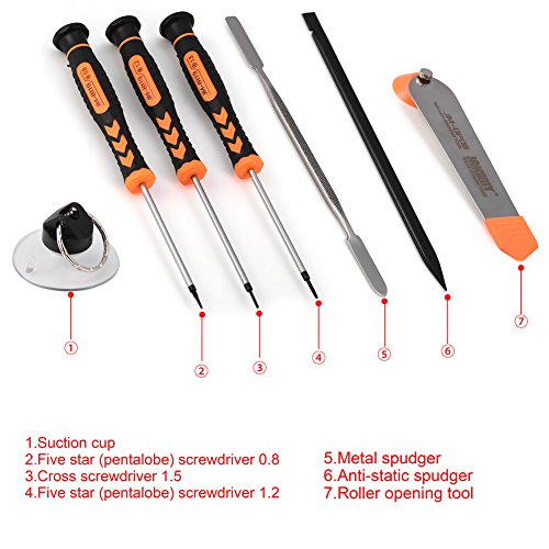 - このツールセットは、5つ星(ペンタベ)スクリュードライバ0.8 1.2、1つの十字スクリュードライバ1.5、1つの吸引カップ、1つのローラー開口ツール、1つの静電防止スパージャーおよび1つの金属スパージャーです。