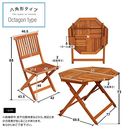 - 【サイズ】[八角形セット]テーブル(x1):幅90x奥行90x高さ73cm、チェアー(x4):幅46.5x奥行59.5x高さ88cm 【梱包サイズ】テーブル:118x96x7cm(約9kg)、チェアー各2脚:107x50x21cm(約11kg)※3梱包