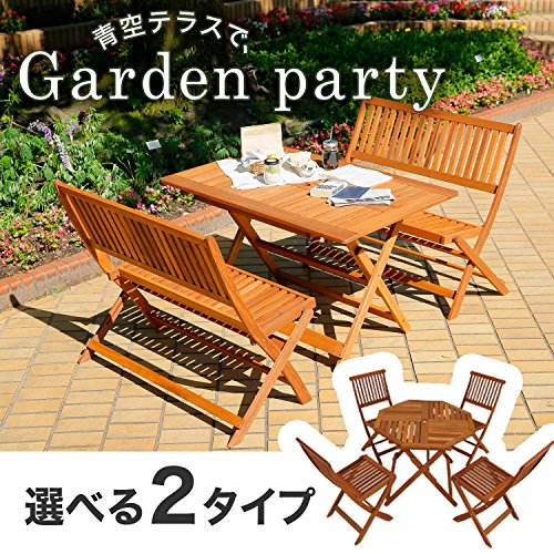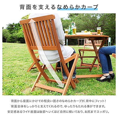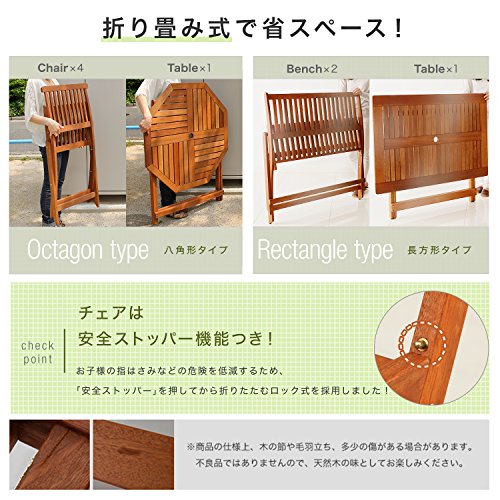 - ※テーブル1卓、チェアー4脚の5点セット ※完成品 ※天然木を使用しているため、色・木目が多少異なります。お手入れの際は、汚れやホコリが沈着しないように水気をよく絞った布で優しく拭き取ってください。 ※天候の影響や長期間の使用により、徐々に色褪せやささくれなど出てくる場合があります。市販の屋外用木材メンテナンス塗料を塗るなど定期的なお手入れを行なっていただくことで、木材の劣化防止になります。