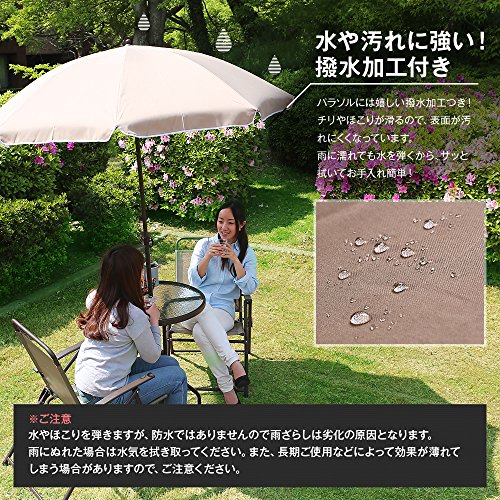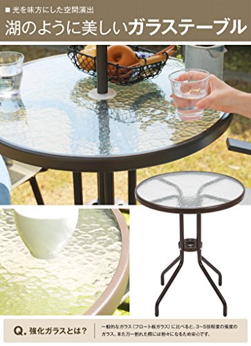 - 【素材】[テーブル]ガラス、スチール(エポキシ樹脂塗装) [チェア]テキストレイン、スチール(エポキシ樹脂塗装) [パラソル]ポリエステル、スチール(エポキシ樹脂塗装)