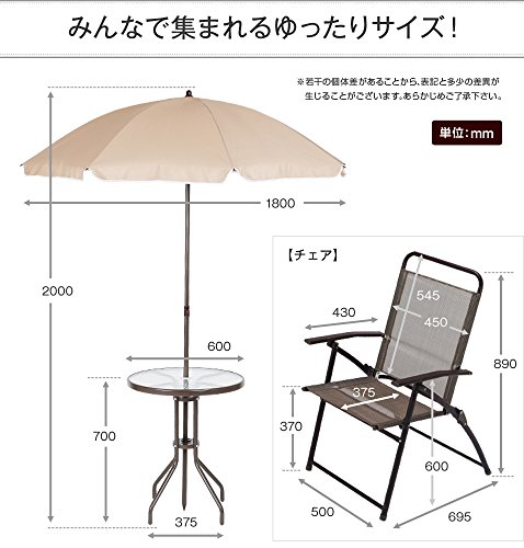 - ●2人掛け【サイズ】テーブル:幅600×奥行600×高さ695mm、チェア:幅540×奥行695×高さ890(座面高370)mm、パラソル:直径1800×高さ2000mm
