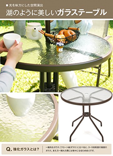 - 【素材】[テーブル]ガラス、スチール(エポキシ樹脂塗装) [チェア]テキストレイン、スチール(エポキシ樹脂塗装) [パラソル]ポリエステル、スチール(エポキシ樹脂塗装)