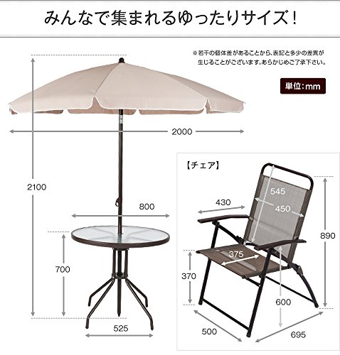 - ●4人掛け【サイズ】テーブル:幅800×奥行800×高さ700mm、チェア:幅550×奥行695×高さ890(座面高370)mm、パラソル:直径2000×高さ2100mm