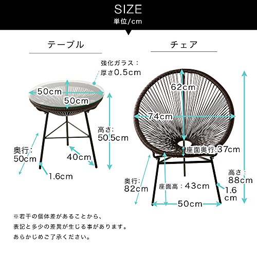 - 【サイズ】テーブル:幅50x奥行50x高さ50cm、チェア:幅74x奥行82x高さ88cm