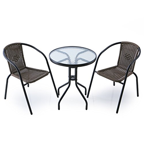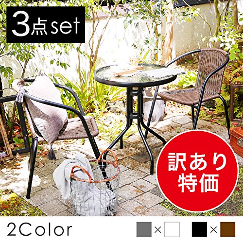 LOWYA (ロウヤ) 【アウトレット品】 ガーデンテーブル 3点セット 強化ガラス ラタン調デザイン 簡単組立て スタッキング ガーデンチェア ブラック/ダークブラウン