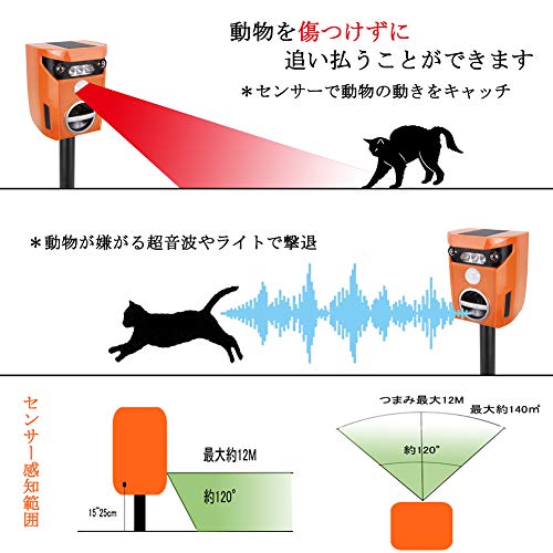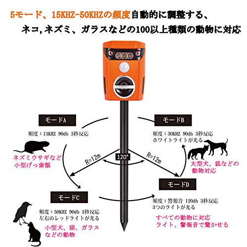 - * 5ワーキングモード&160+種類の動物撃退:本撃退器はワーキングモードが5つあり、動物の動きを発見すれば、動物が逃げるまで、自動的に順番に5つモード変動します。ネコ、いぬ、鹿、リス、ネズミなど160種類の侵入動物を有効的に撃退!