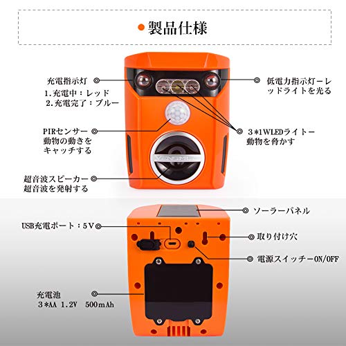 - * PIRセンサー:PIRセンサーは動物の動きを検知するとすぐに仕事始め、より大きな感知範囲やより敏感な赤外線センサーで侵入した動物を追い払われます。