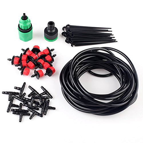 VERY100 ドリップ灌漑システム散水用具 10mドリップ灌漑セット (10mホール、15個調節可能ドリッパー、ワンタッチ蛇口アダプター、14個3方向分岐コネクター、15個固定ステム) 水道の蛇口をひねるだけで簡単に散水でき