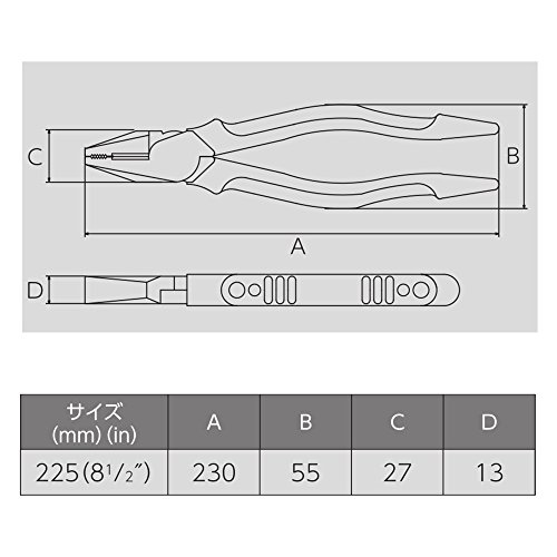 ●理想的な刃角度でシャープな切れ味。●職人から生まれた究極のプロ用工具。●偏心機構採用による軽い切れ味。●通常商品より軽量化をはかり、携帯性と作業性をアップ。●発泡性エラストマ(エアークッション)使用で手への疲れが今までの半分。●※生産1ヶ月以内の樹脂使用。●グリップが柔らかいので手に吸付くようなフィット感が得られます。●人間工学に基づいたグリップ形状で握りやすい。●耐薬品性に優れている。●(当社比)●従来商品に対し耐電性に優れている。●(当社比)●焼却や加熱時にダイオキシンが発生しないので環境に優しい。●独自開発の刃形状ですので、切れ味、耐久性に優れています。●パッケージサイズ/縦:280mm横:82mm高さ:19mm●パッケージ重量:356g●生産国:日本●材質:S58C-60M●用途:軟鉄線、銅線、VA線などの切断作業・厚みの薄い物を掴む作業・軽天、空調工事等●サイズ:225mm全長:230mm製品重量:340g●耐電性能●硬度(刃部):HRC58~61●切断能力/鉄線:直径3.6mm銅線:直径4.6mm硬鋼線:0.3mmピアノ線:直径...