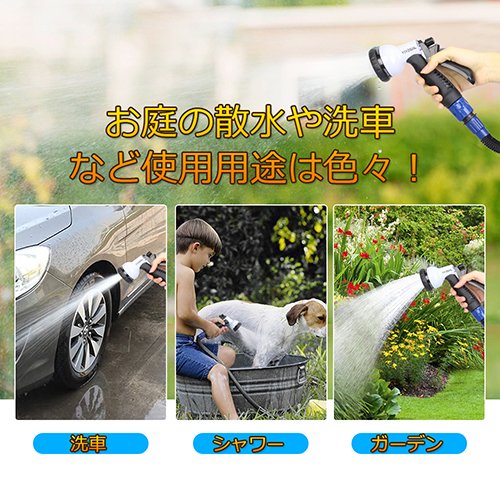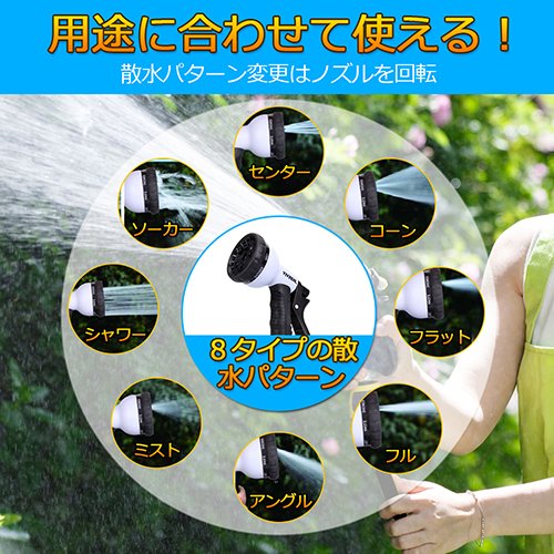 - 【8パターンつき】色々な場合に利用できる多機能なホース ミスト:オフィス・洗面所・室内に適用、 ソーカー:ガラスドア、窓などに適用、 フラット:廊下・床などの掃除に適用、 コーン:砂払いなどの大面積作業に適用、 シャワー:ガーデニング・ペットのシャワーに適用、 フル:洗車・農作物の水やり・洗剤の泡立てに適用、 センター:庭・ガーデンなどの大面積の水やりに適用、 アングル:壁の汚れ・クーラーの清掃・凍結したガラスなどに適用