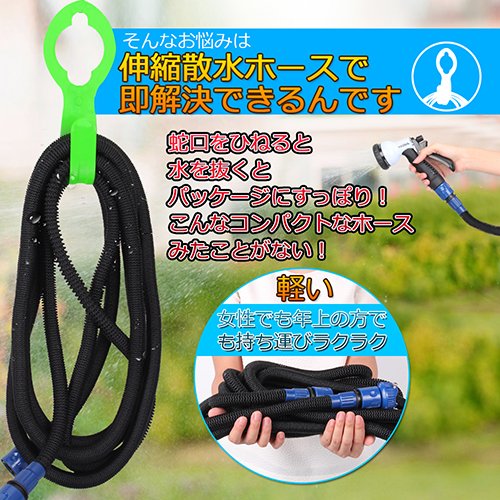 - 【強い伸縮力】 蛇口をひねるだけでぐんぐん伸び、約15秒で伸縮自由のホースになる! 3倍に伸びる!伸縮自由ホース 5~15m。熱、磨耗と高圧への耐久性に強いです。水を抜くとみるみる縮んで元に戻ります。片手で楽々持てる軽さ、スルスル伸びて絡まらないです。昔ながらの散水ホースリールの重い・絡まる・かさばるの三大ストレスから解放します!