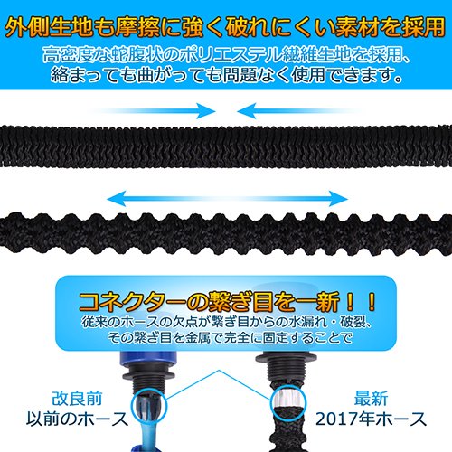 - 【驚く耐久性】 耐圧、耐熱、防寒、劣化しにくい、長くご使用いただくために耐久性をアップした伸縮ホース!例え真冬の時でも、爆裂や断裂の心配もなく、安心に利用できる伸びるホース。 ラテックスとボリエステル繊維の二層構造で折りたり絡まったりしません。従来品よりも耐久性改良し、散水パターンも増え、洗車やガーデニングをもっと楽に!