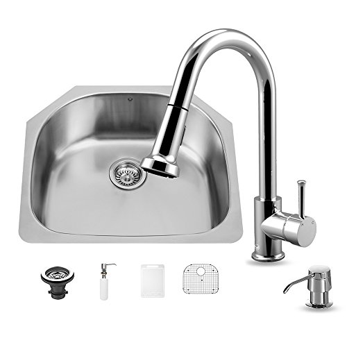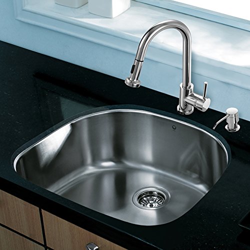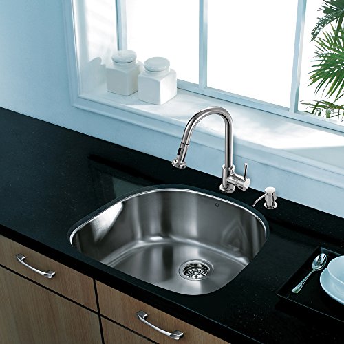 Vigo 24インチアンダーマウントシングルボウル18ゲージステンレススチールキッチンシンクとハリソンクローム蛇口、グリッド型部品、ストレーナー、ソープディスペンサー