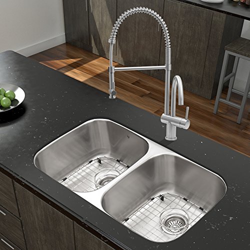 Vigo 32インチアンダーマウント50 / 50ダブルボウル18ゲージステンレススチールwithドレスデンステンレススチールキッチンシンク蛇口、2つグリッド、2つStrainersとソープディスペンサー