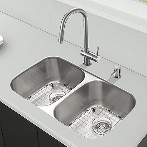 Vigo 32インチアンダーマウント50 / 50ダブルボウル18ゲージステンレススチールwith Gramercyステンレススチールキッチンシンク蛇口、2つグリッド、2つStrainersとソープディスペンサー