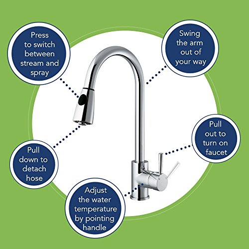 - Overall Height: 15.125-in., Spout Reach: 9-in., 360-degree swivel spout