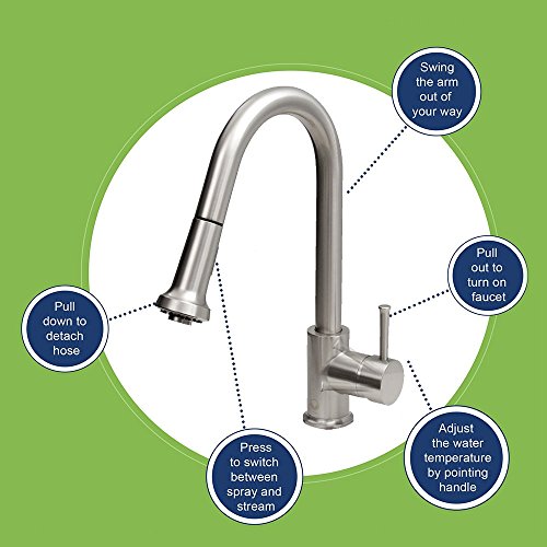 - Overall Height: 15.125-in., Spout Reach: 8.5-in., 360-degree swivel spout