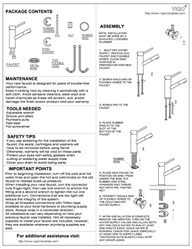Single lever for water and temperature control, 1.2 GPM flow rate. All mounting hardware and hot/cold water lines included, standard US plumbing .375-in. connections. Bring style and versatility to any bathroom décor with VIGO's faucets. Solid brass construction ensures durability and longer life. A high quality ceramic disc cartridge means a drip-free, long lasting faucet. There are different finishes available to customize your look. All VIGO finishes resist corrosion and tarnishing, exceeding industry durability standards. Pair this one-of-a-kind faucet with any basin or undermount sink to create a bold look in your bathroom.