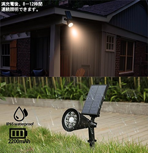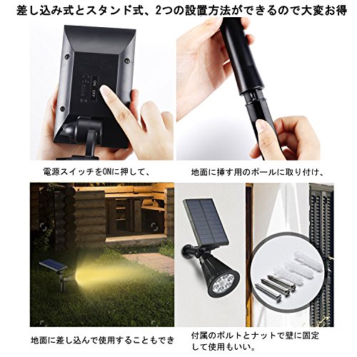 - ● ソーラー充電:発電効率の良いソーラーパネルと高容量のバッテリーのおかげでとても明るいLEDライトを利用できる。ご注意:製品をご使用前に、まず、電源をONにして、日当たりの良い場所にご充電ください。