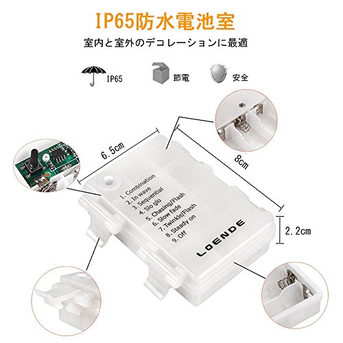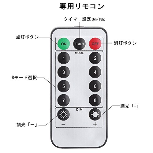 - ● リモコン付き:専用のリモコンが付き、タイマー設定、明るさ調整と点灯モード(8 パターン)を選択する操作が出来、使いやすい。