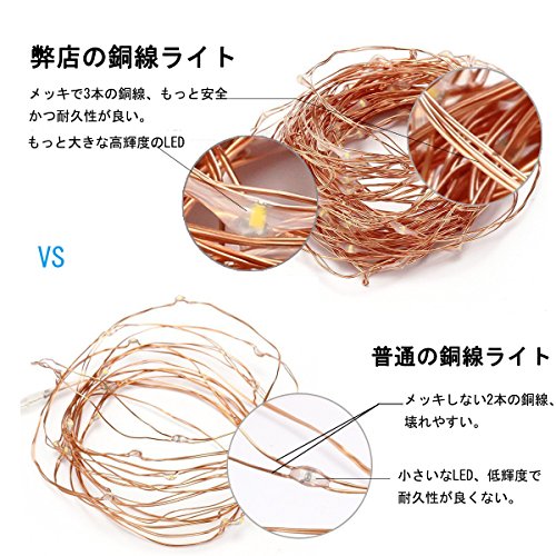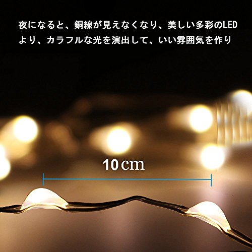 - ● 暖白LED:10m銅線に100LEDが装備されていて、優しい光で、とてもリラックスできるあかりです。LEDなので、省エネで長持ちするライトを使用していますから、長く使うことができます。十分な長さがあるので、窓や壁などにも使えます。 キラキラと宝石のような輝きのジュエリーライトです。