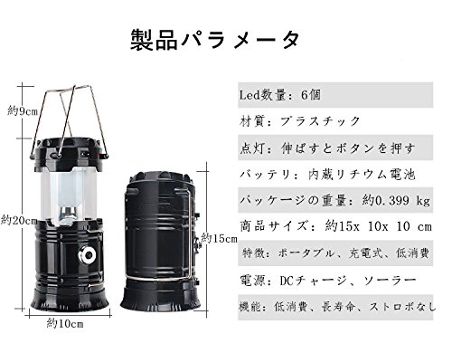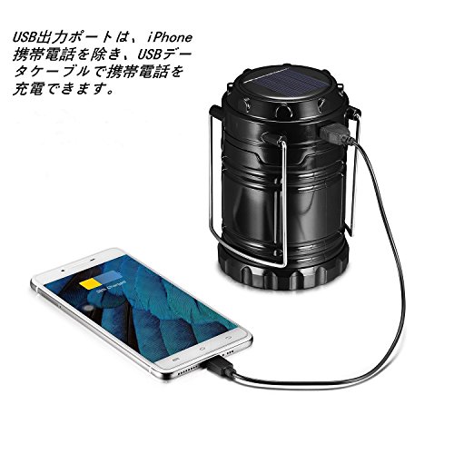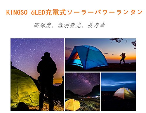 - ★【多機能】USB出力ポートは、IPhoneの携帯電話を除き、USBデータケーブルで携帯電話に充電できます。KINGSO 6LED充電式ソーラーパワー野営ランタンは自分の携帯電話を充電することができますが、携帯電話は完全に充電することができず、ちょっと応急充しかない。主要機能は照明を使うため、携帯電話の充電に対する要求の高い需要慎重に購入してください!
