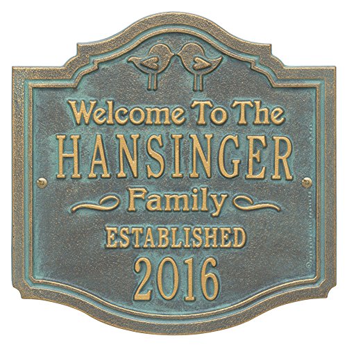 この2つのキスをする鳥がくれた、温かい歓迎上のゲストにパーソナライズされた壁プラーク。個人とエレガント、最高の新築祝いやウェディングのギフトに最適です。sand-castリサイクルされたアルミ板は上げ文字と、耐候性の素敵な緑青を開発する仕上がりが永久に続きの間、年齢に最適。12 " X 12 ",状態で出荷されます。そのため屋内でハングアウトすることができます。取り付けネジ付属7つの仕上げがされています。まで3週間かかります。提供ラッシュしないまたはギフトボックスをオンにします。パーソナライズの1行11文字と年が表示されます。みだらな言葉ないください。